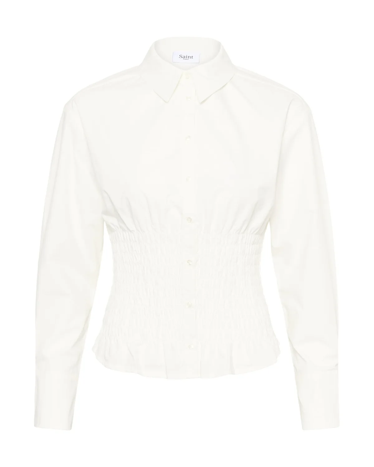 Dit getailleerde overhemd heeft een puntkraag, knoopsluiting en lange mouwen. De gesmokte taille benadrukt het silhouet en de stijlvolle uitstraling.
