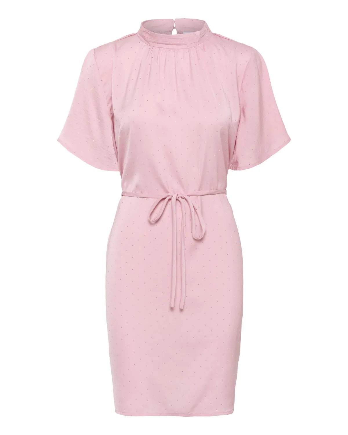 Deze korte jurk heeft een subtiele stiptextuur, een losse rechte pasvorm en een hoge halslijn met lichte plooien. Brede korte mouwen en een dun verstelbaar strikceintuur maken het ontwerp af. De zoom valt boven de knie.