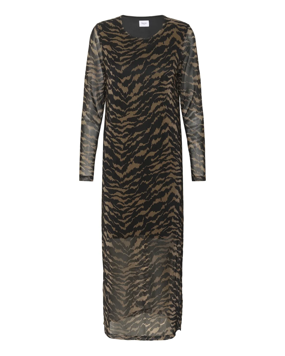 Deze aansluitende mesh midi jurk met lange mouwen biedt een eigentijds silhouet. De ronde hals en doorschijnende stof maken dit model comfortabel en geschikt voor diverse gelegenheden.