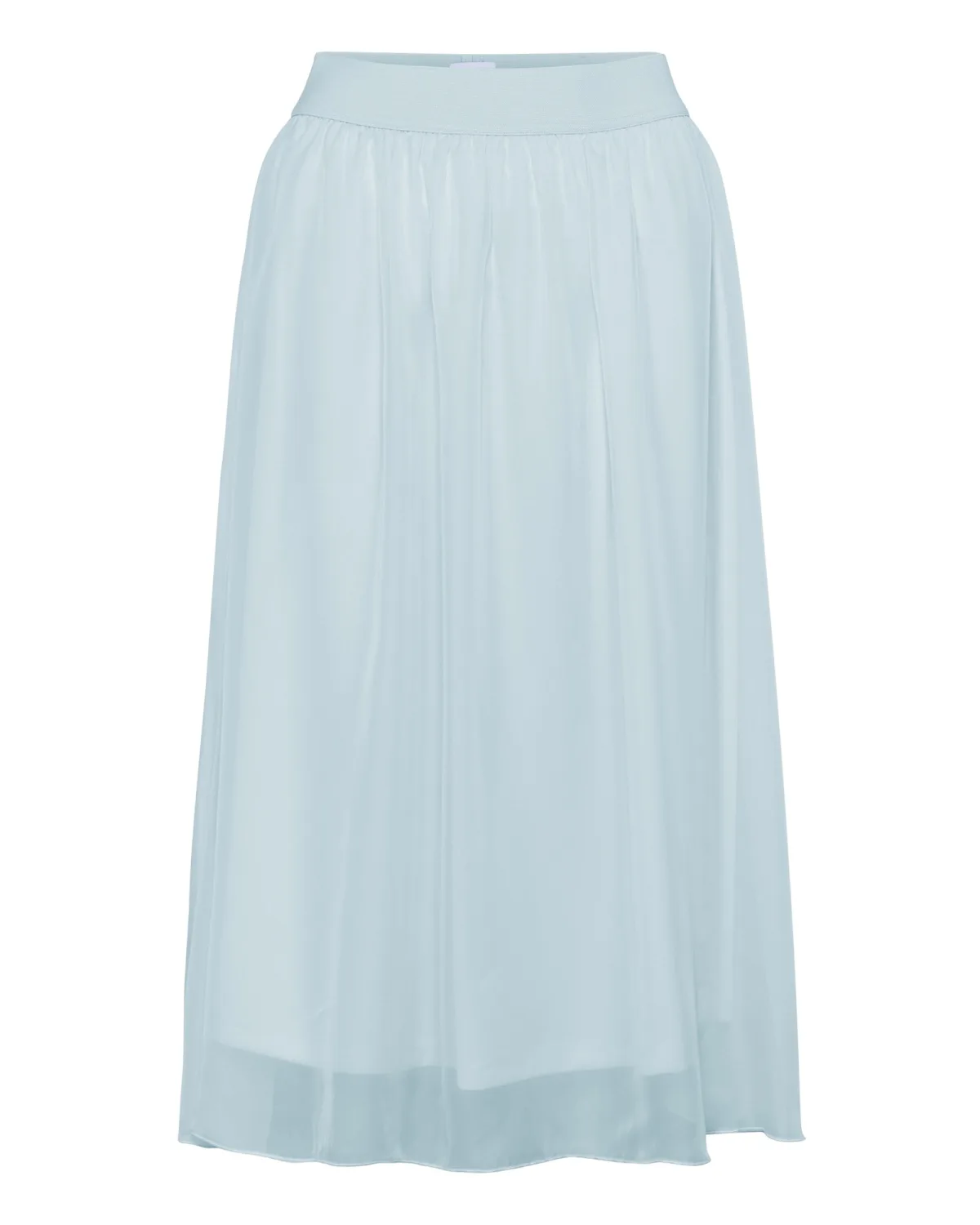 Deze midi-rok heeft een zwierig, gelaagd ontwerp met een halfdoorzichtig buitenmateriaal dat een lichte en luchtige uitstraling geeft. De elastische tailleband zorgt voor een comfortabele pasvorm, ideaal voor zowel casual als chique gelegenheden.