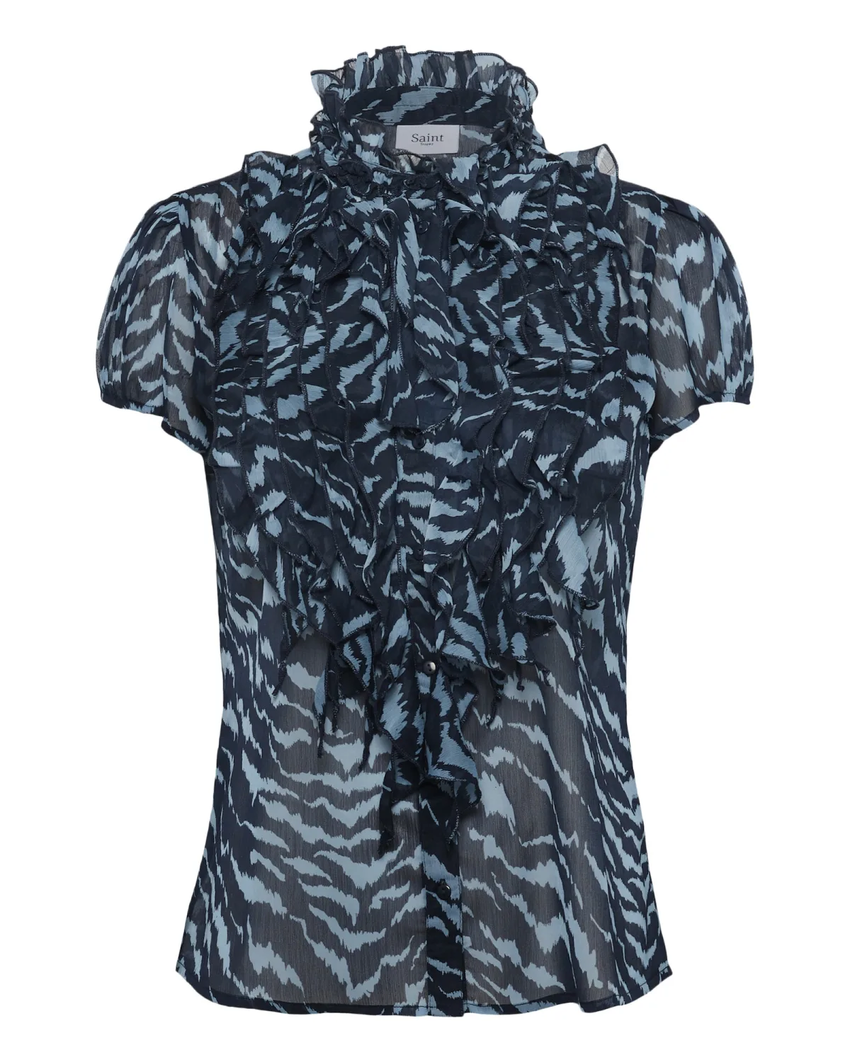 Blouse type: Klassieke blouse; Type sluiting: Knoopsluiting; Halstype: Opstaande kraag; Motief: Dierenprint; Kraag: Opstaande kraag; Details: Ruches, Volant, Gedrapeerd; Pasvorm: Normale pasvorm; Armlengte: Kwartmouw; Lengte: Normale lengte