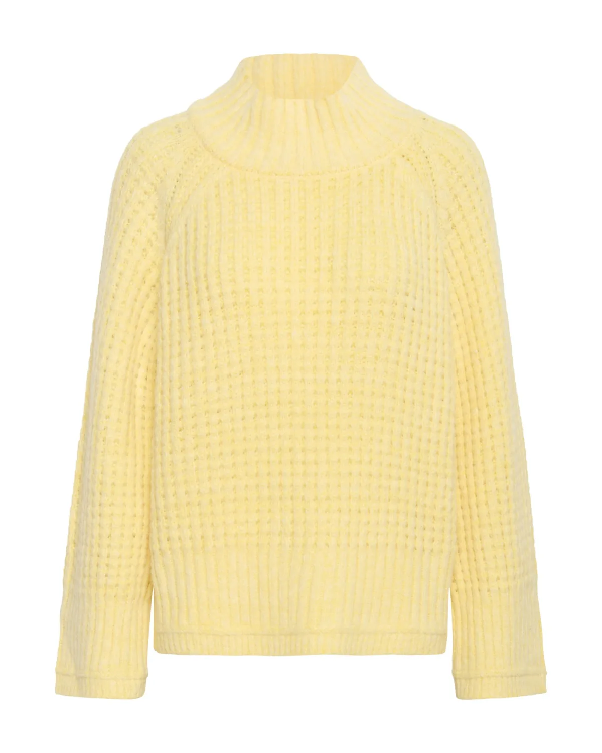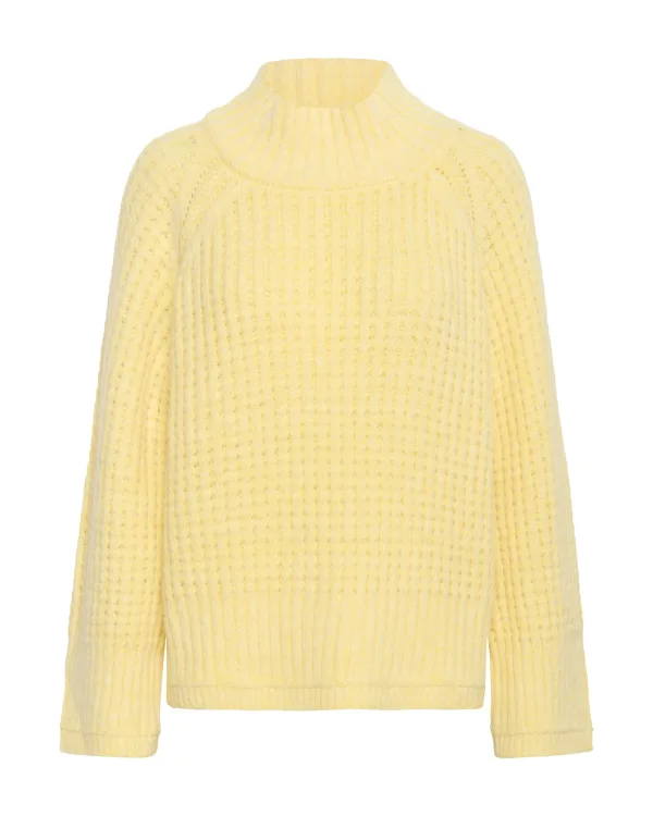 Grof gebreide trui met rechte, boxy pasvorm en brede ribgebreide opstaande kraag. Textuur door wafelstructuur, lange iets wijde mouwen. Gewoon ribboord aan de zoom en manchetten.