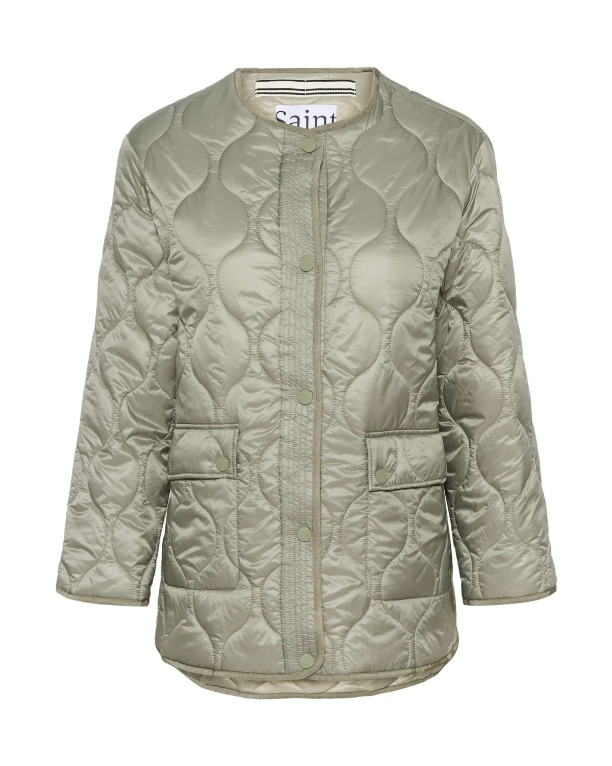 Deze quilted jas heeft een recht model met een ronde halslijn en drukknoopsluiting. Het ontwerp is afgewerkt met twee klepzakken aan de voorkant en een golvend doorgestikt patroon. De mouwen zijn lang en wat wijder.