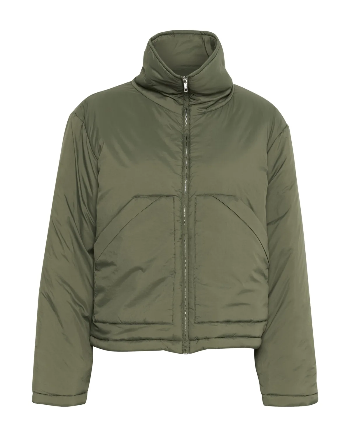 Dames pufferjack met een comfortabele, relaxte pasvorm, hoge kraag, volledige ritssluiting en handige voorzakken. Ideaal voor dagelijks gebruik en gelaagde looks.