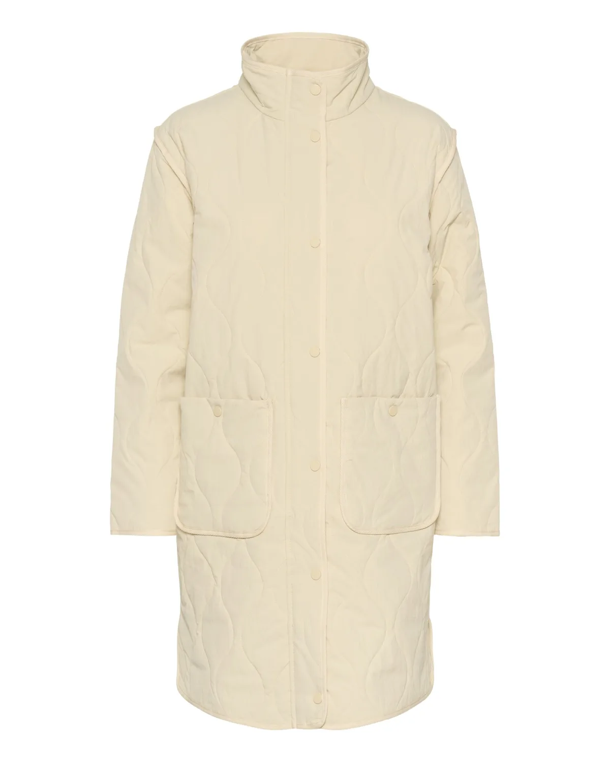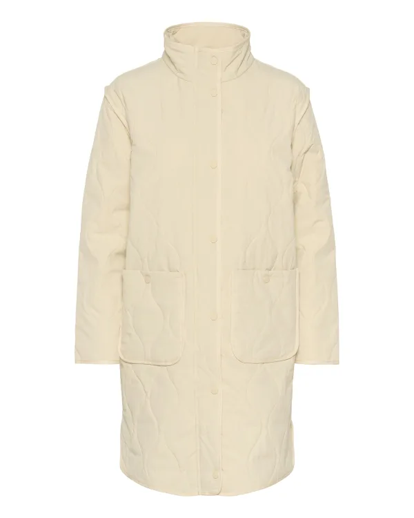 Gewatteerde jas met rechte pasvorm, hoge opstaande kraag, drukknopen aan de voorkant en twee grote opgestikte zakken. Middenlange, gestructureerde uitstraling.