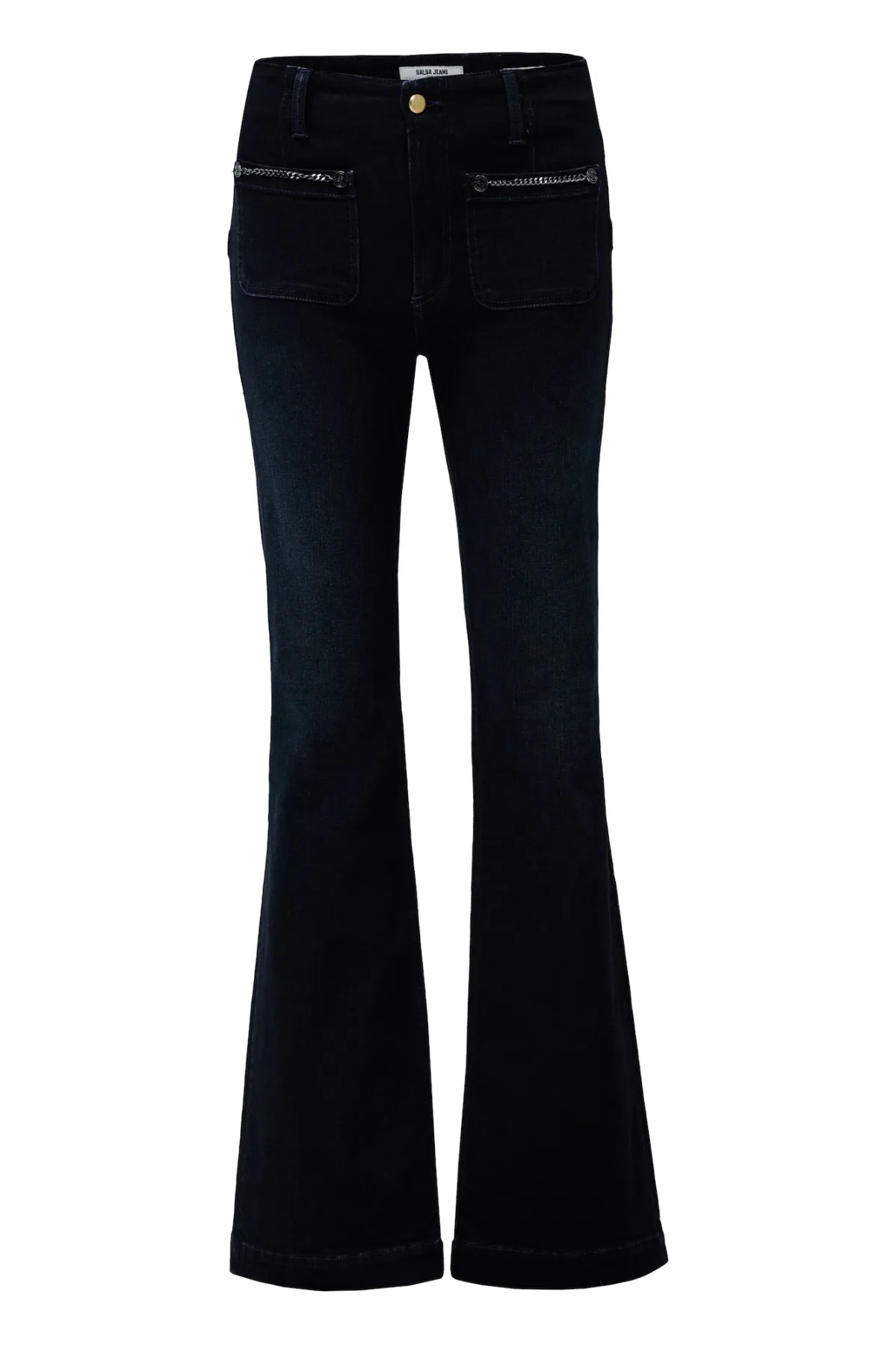 Design: Ritssluiting, Achterzak, Knop sluiting; Type sluiting: Knoopsluiting; Materiaal: Denim; Motief: Effen; Extra's: Label patch/label flag, Riemlussen; Wassing: Rinsed/dark washed; Lengte: Lang/maxi; Pasvorm: Flared; Taillehoogte: Mid waist
