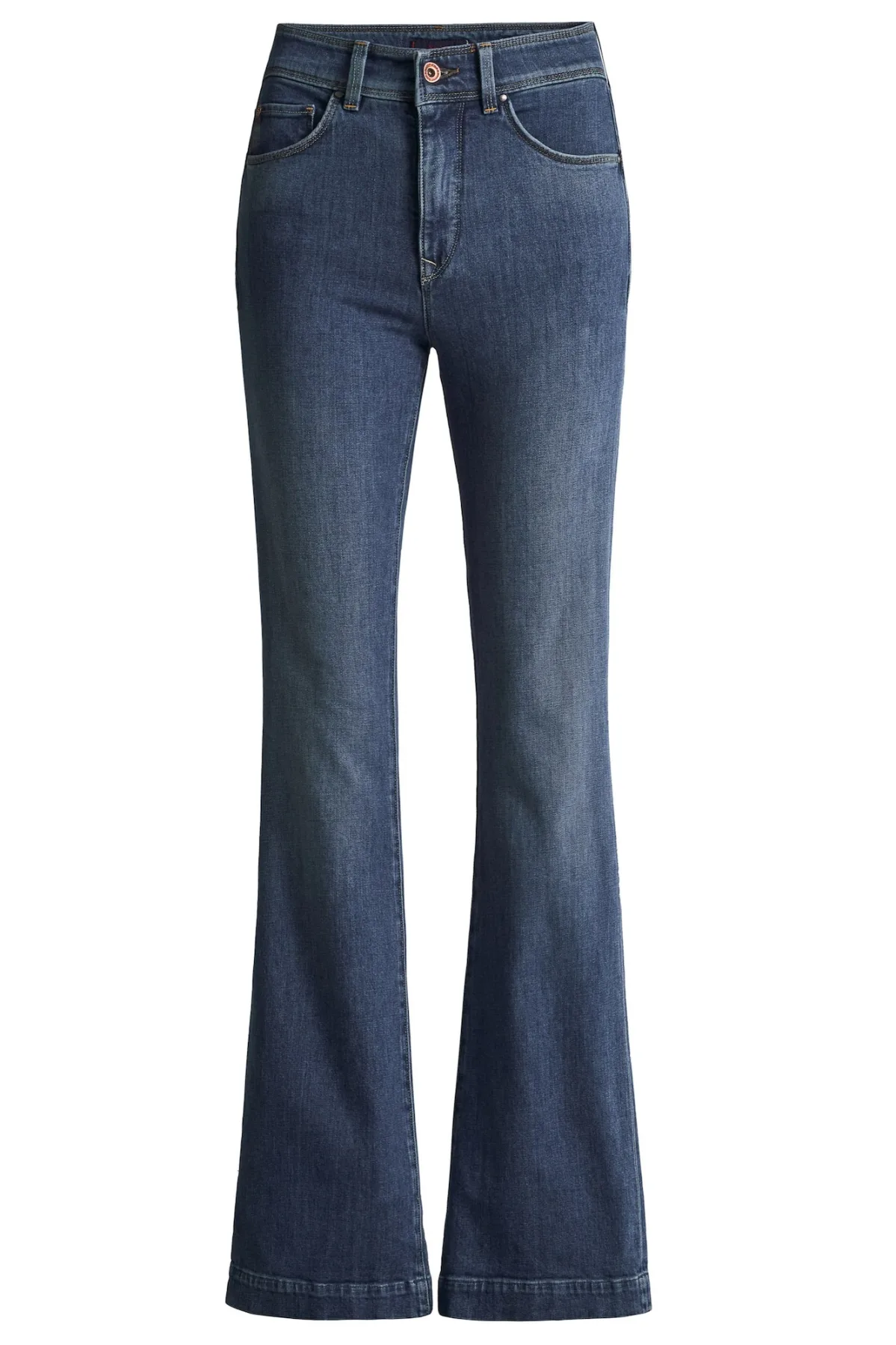De Faith push inn flare (21004234) van SALSA is een flared jeans broek met een hoge taille, rits-knoopsluiting, riemlusjes, steekzakken aan de voorkant, faux paspelzakken aan de achterkant en een push in effect. Deze broek heeft een aangesloten pasvorm en is uitgevoerd in de kleur Original blue. Het model op de foto is 1.78 cm lang en draagt maat S. De stof is gemaakt van katoen en elastaan.