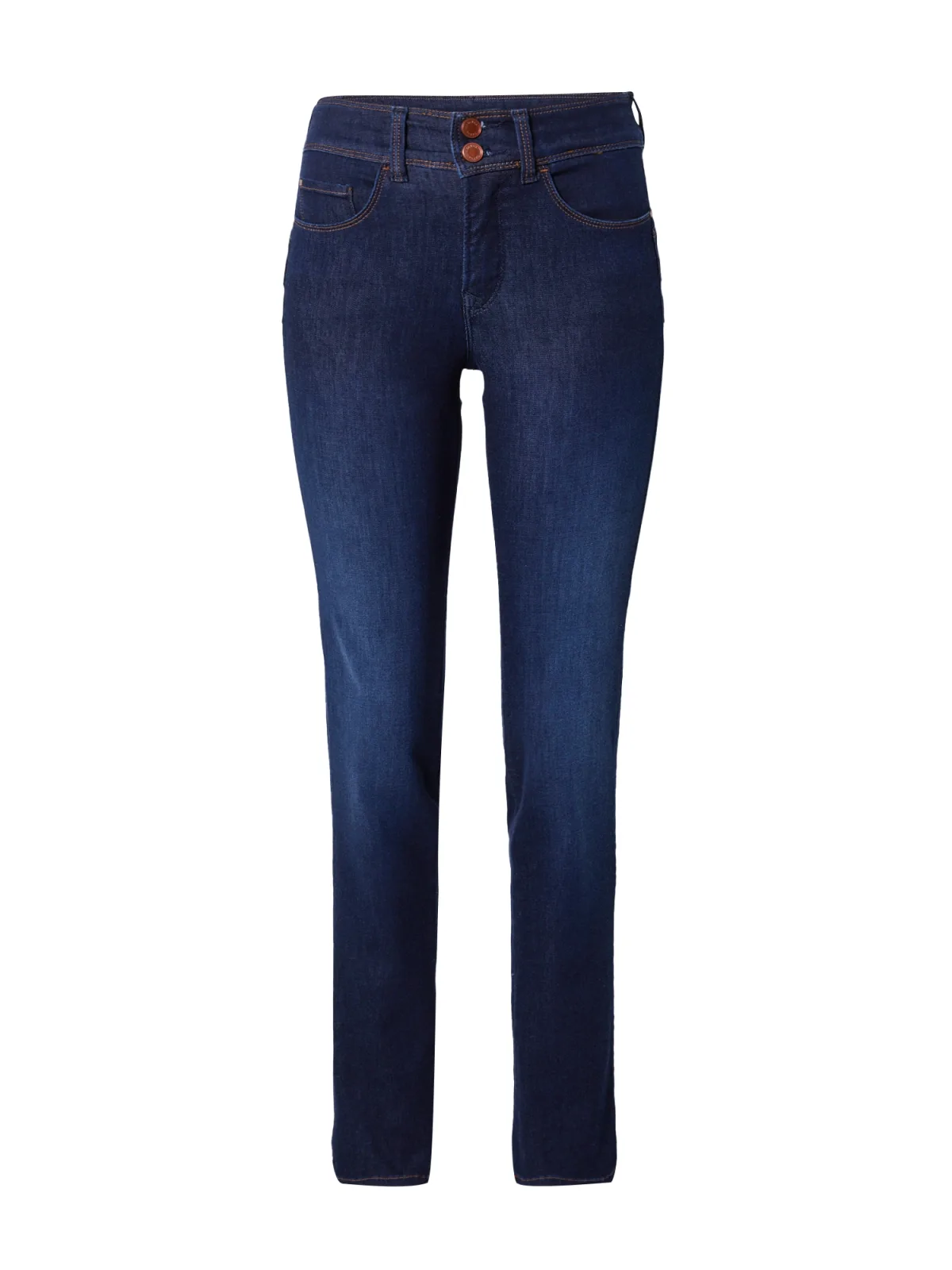 Design: Wijde taille, 5-pocket-style; Materiaal: Denim; Motief: Effen; Extra's: Contrasterende naden, Riemlussen; Wassing: Rinsed/dark washed; Lengte: Lang/maxi; Pasvorm: Slimfit; Taillehoogte: Mid waist