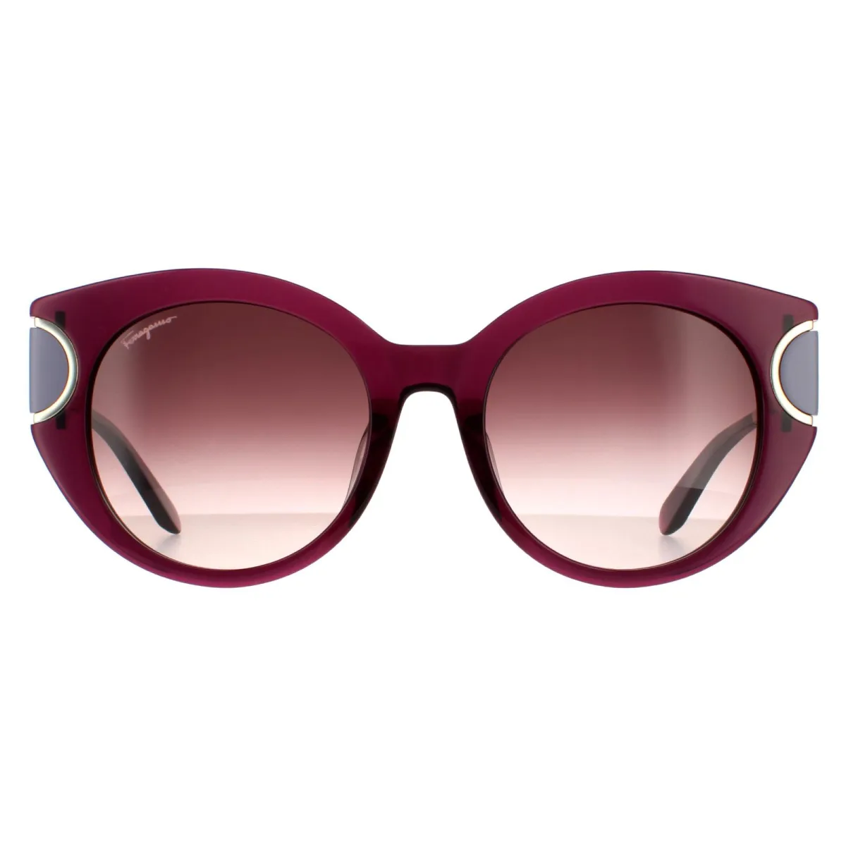 Salvatore Ferragamo zonnebril SF840SA 500 Violet Brown Wine Gradient zijn een chique kattenoogstijl gemaakt van metaal en plastic met contrasterende kleurblokken aan de buitenrand van de frames.