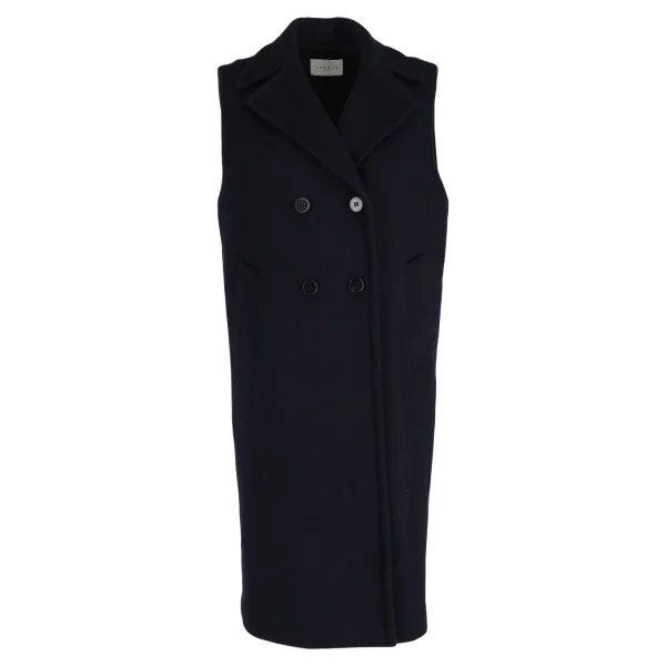 Specificaties: Sandro Paris mouwloze double-breasted jas van marineblauwe wol.