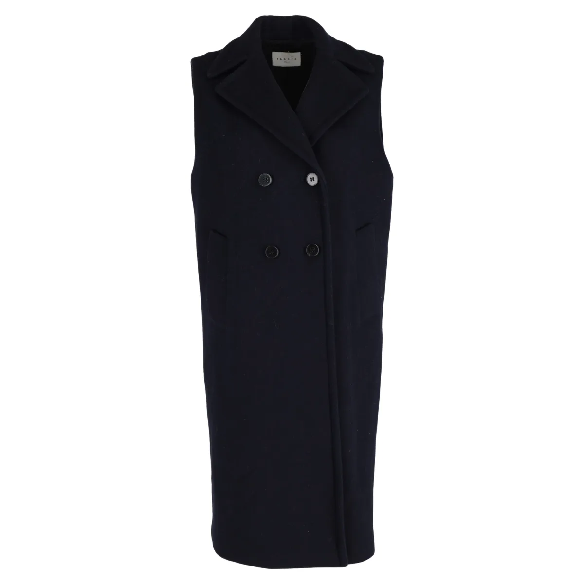 Sandro Paris mouwloze double-breasted jas van marineblauwe wol.