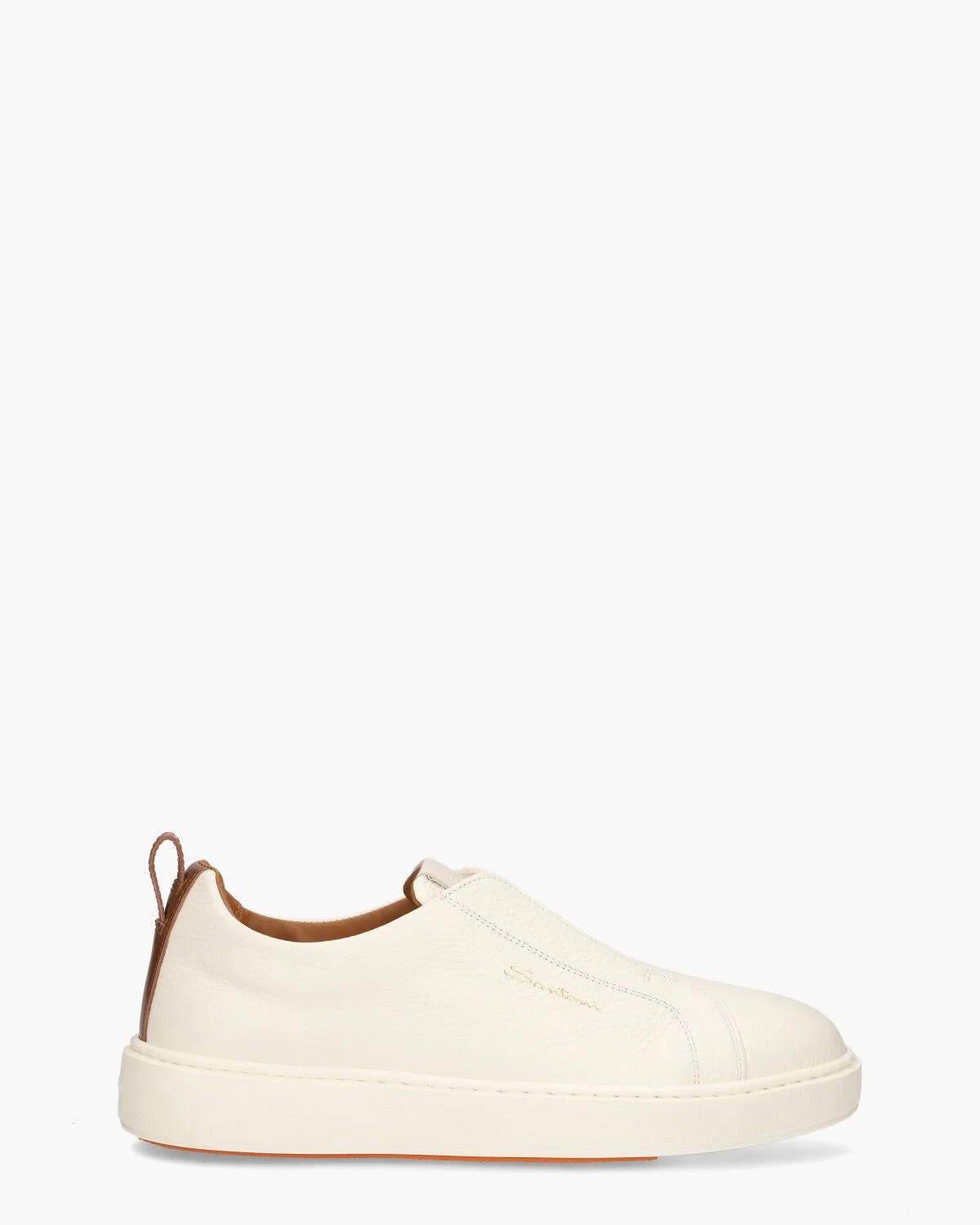 Sneakers voor heren 21959 van het merk Santoni. Deze handgemaakte herenschoenen zijn in wit gestructureerd leder uitgevoerd. De elastische tong en de gestikte afwerking geven dit instapmodel een unieke look. De binnenkant is in soepel kalfsleder uitgevoerd. Branding opzij, op de tong, bruine leren hielbewerking en een witte rubberen cupzool