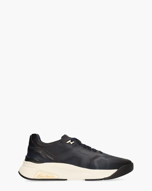 De herensneakers model 22012 van Santoni, handgemaakt in Italië, combineren stijl en comfort in een sportief ontwerp. Met een bovenwerk van donkerblauw deels geperforeerd leer voelt de schoen aan als een sok om je voet. De voering van leer en stof biedt extra comfort, terwijl het vaste voetbed stabiliteit garandeert. Subtiele branding op de