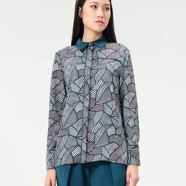 Een stuk stijl dat je garderobe bekrachtigt en gemakkelijk bij elkaar past met kleermakersrok en jas op het werk. Een geometrische print met een nogal vintage stijl in een ademende en gemakkelijk te strijken stof. Verfraaid met een mat satijn op kraag en manchetten. Een timemess -item. Productdetails: • vorm: klassiek, recht • Lengte: 66 cm • Lange mouwen • Kraag • Knoopsluiting middenvoor