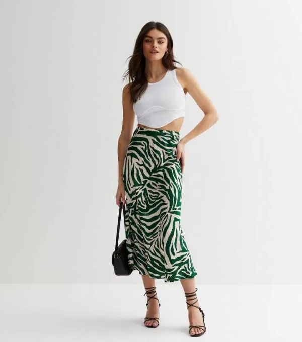 Voor het feestseizoen vul je dit zijdezachte satijn met je rondingen. Deze bias-cut beauty heeft een opvallende groene zebraprint en rimpelt romantisch bij elke stap. Deze rok past in de taille en heeft een flatterende knuffel in zeemeerminstijl. Voor een statement-look combineer je ze met een mouwloze top en hakken met bandjes.