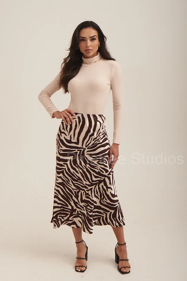 Voor het feestseizoen vul je dit zijdezachte satijn met je rondingen. Deze bias-cut beauty heeft een opvallende groene zebraprint en rimpelt romantisch bij elke stap. Deze rok past in de taille en heeft een flatterende knuffel in zeemeerminstijl. Voor een statement-look combineer je ze met een mouwloze top en hakken met bandjes.