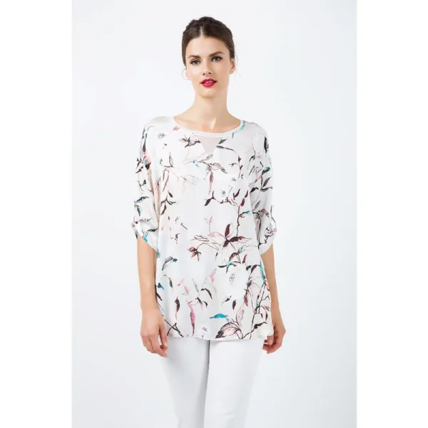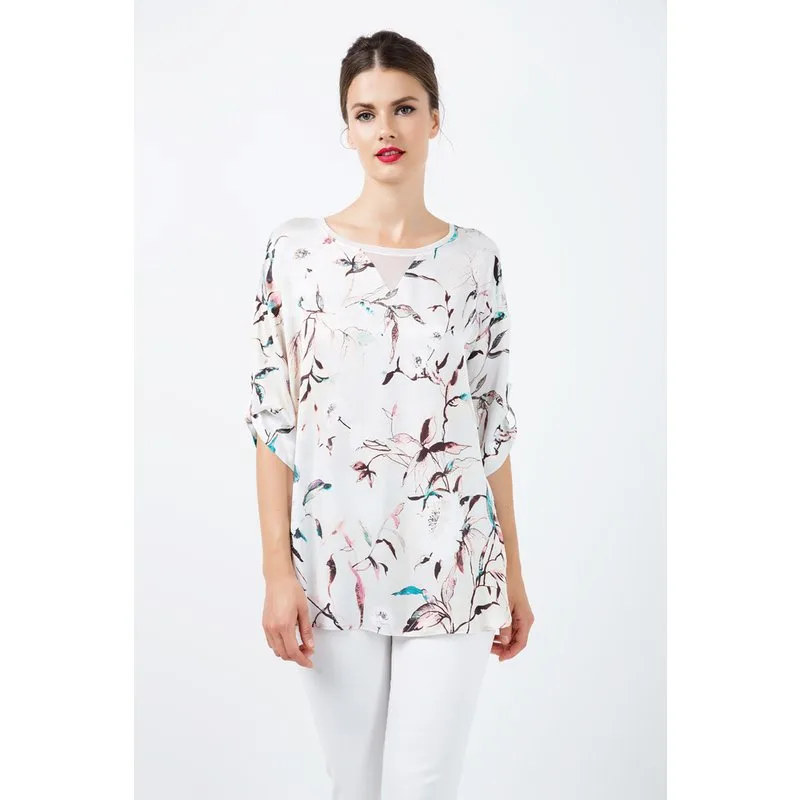 Bedrukte top van geweven satijnachtige stof, 100% viscose. Ronde hals en ¾ mouwen. Crèmekleurige, glanzende bies bij de hals, 1 cm. Een V in crèmekleurige stof aan de voorkant onder de hals. Lusje en knoopje aan de mouwen om op te rollen. Een naad in het midden van de rug die doorloopt tot de split van 22 cm onderaan. Ongelijke zoom aan de achterkant afgerond. De voorkant is 10 cm korter. Ontspannen recht silhouet.Ons model is 178 cm lang en draagt maat 36. Afmetingen voor maat 38 (in cm):Buste-53; Lichaamslengte-72; Taille-53; Schouderbreedte-60; Zoomlijn-57; Mouwlengte-26. Kledingstuk is oversized.