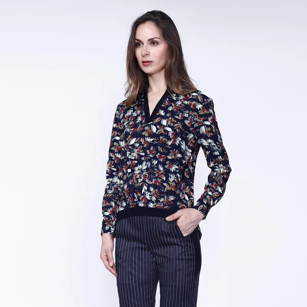 Een eenvoudig en stijlvol stuk, deze blouse bekrachtigt je garderobe met zijn bloemenprint met herfsttinten. Verfraaid met lint op de voorste zoom en satijn op halslijn. Een informele stijl die wordt geassocieerd met rechte broek of leggins. Productdetails : Rechte vorm Lengte: 69 cm Lange mouwen V-hals Geen bevestiging
