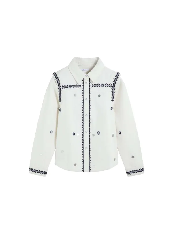 Blouse type: Klassieke blouse; Design: Ronde zoom; Type sluiting: Knoopsluiting; Materiaal: Denim; Kraag: Kentkraag; Extra's: All-over patroon, Applicaties; Pasvorm: Normale pasvorm; Armlengte: Lange mouw; Lengte: Normale lengte