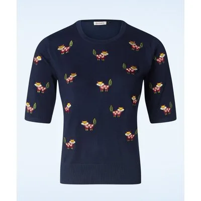 ”Sly, stylish, and oh-so-adorable!” Deze cozy jumper is uitgevoerd in een heerlijke soepele, stretchy navyblauwe viscosemix met geborduurde vosjes. * Stretchy ribboord * Lang genoeg om op een normale heupbroek te dragen