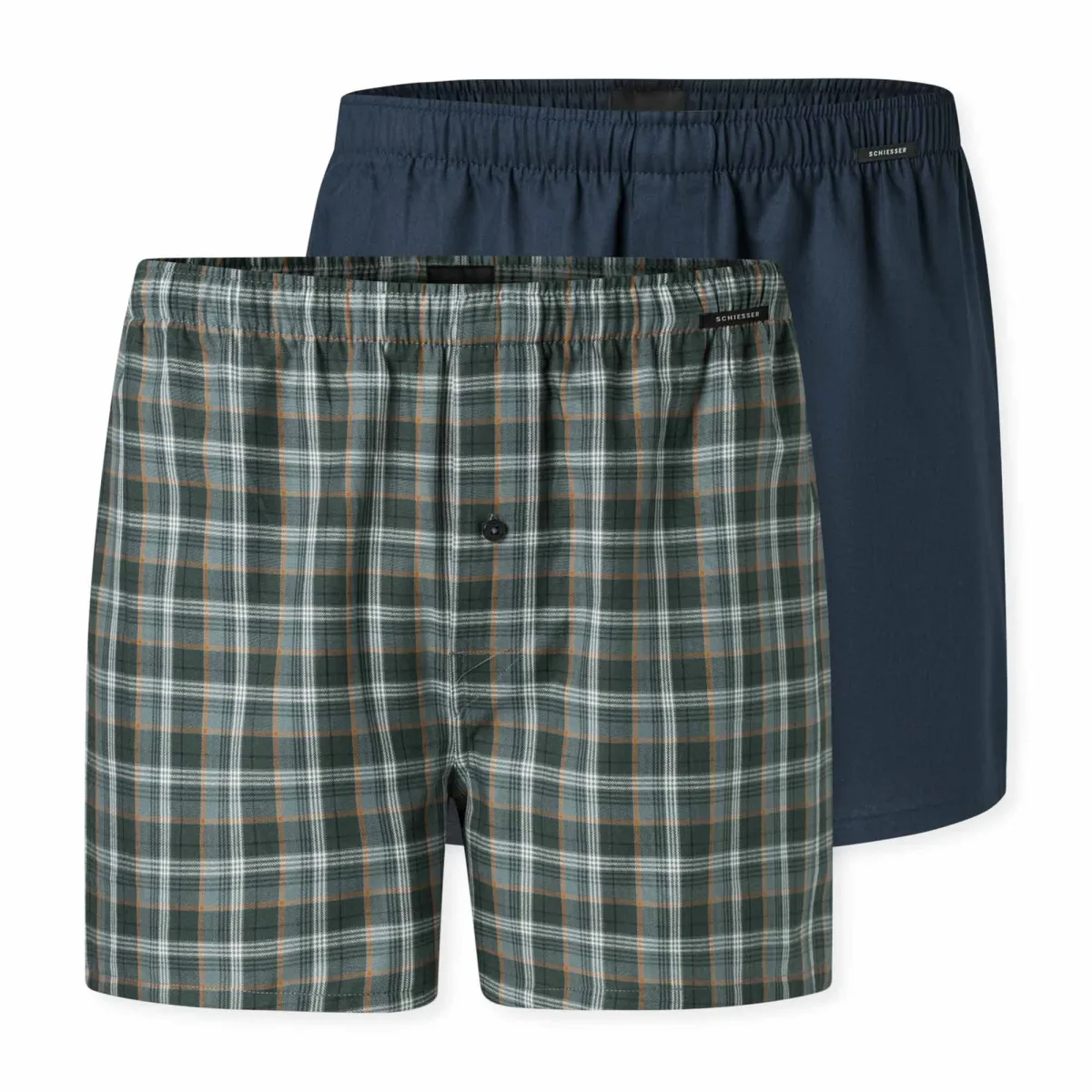 SCHIESSER mannen geweven boxershorts in een praktische 2-pack. Hoogwaardige geweven stof met functionele knoopsluiting en zichtbare knop.