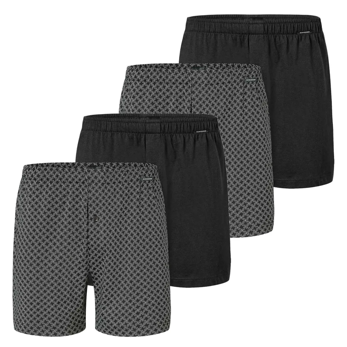 Klassieke, comfortabele jersey boxershorts voor heren van SCHIESSER. In een praktisch set van vier, gemaakt van 100% katoen, losse pasvorm.