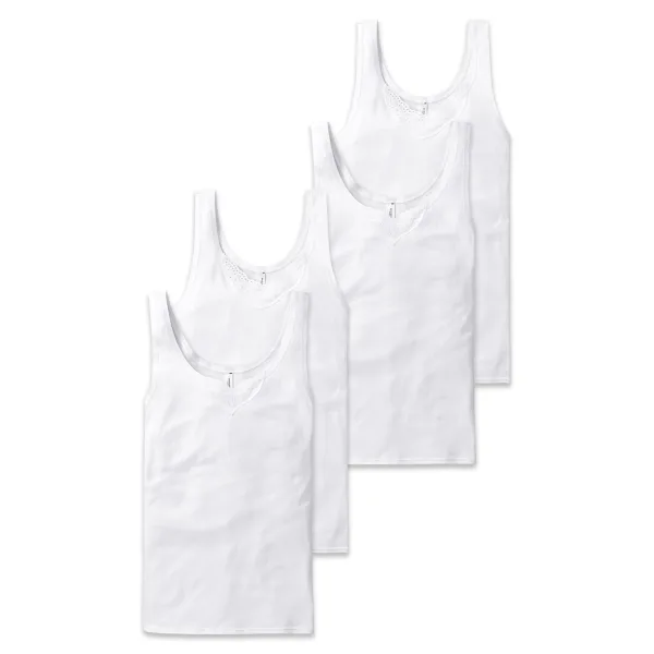 Mouwloze topjes voor dames van SCHIESSER. In een praktische verpakking van vier stuks. Mouwloos met geborduurd inzetstuk bij de halslijn, fijne ribstof van puur katoen.