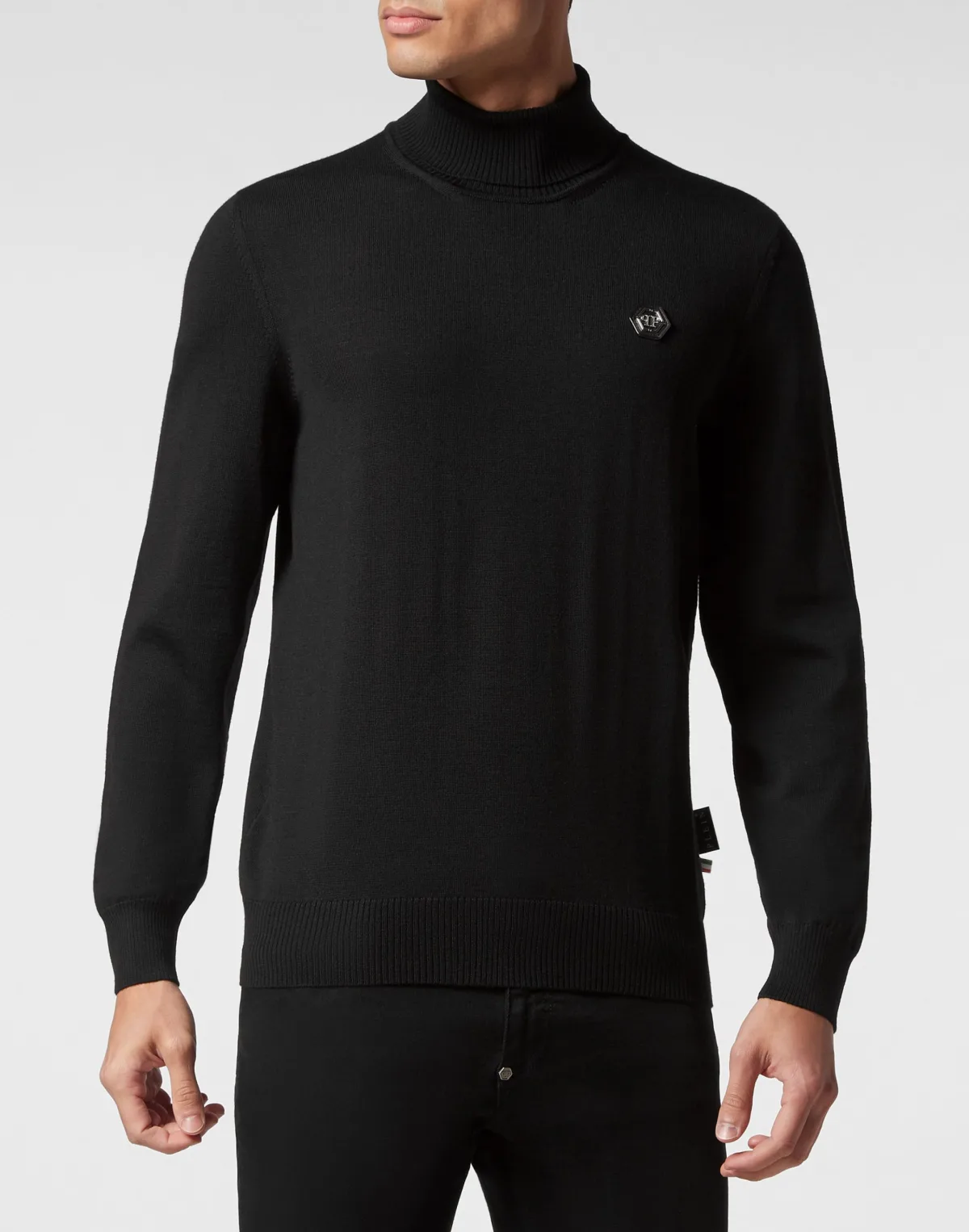 Ontdek hoe je zelfs met een eenvoudige coltrui zoals deze origineel kunt zijn. 18-gauge gebreide extra fijne wol PP Hexagon op een saffiaan lederen badge genaaid op de linkerborst Ribgebreide hals en zomen