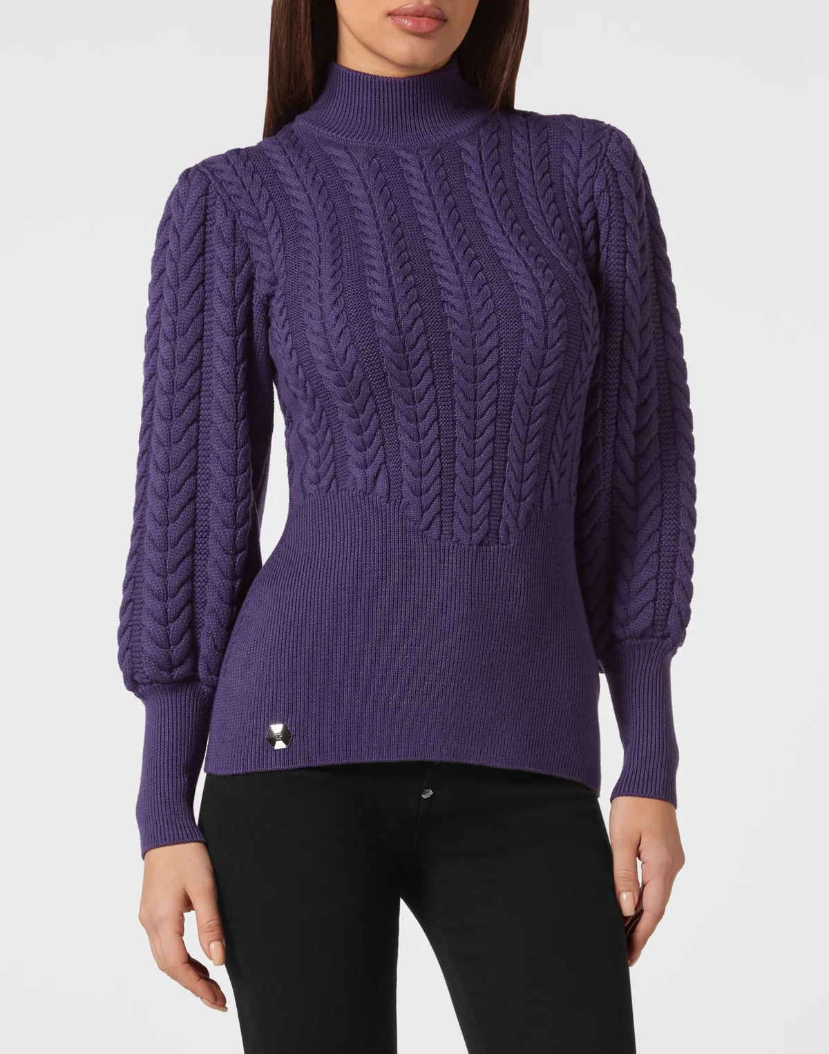 Bekijk de details van deze gebreide pullover met hoge hals en kostbare processen. Gebreide zuiver scheerwol met enkele kabelgebreide details Pofmouwen Metalen PP zeshoek genaaid aan onderkant Ribgebreide zomen