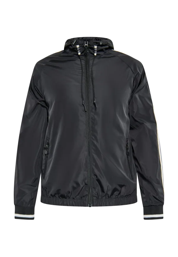 Een jack met capuchon voor optimale functionaliteit. Dit sportieve kledingstuk is uitgerust met verstelbare trekkoorden en een ritssluiting aan de voorkant die doorloopt tot aan het puntje van de kraag. Twee zijzakken met ritssluiting bieden veilige opbergmogelijkheden. Het gestreepte patroon op de manchetten en zoom voegt een vleugje stijl toe aan het algehele ontwerp. Blijf voorop met dit veelzijdige en praktische jack. Blouson