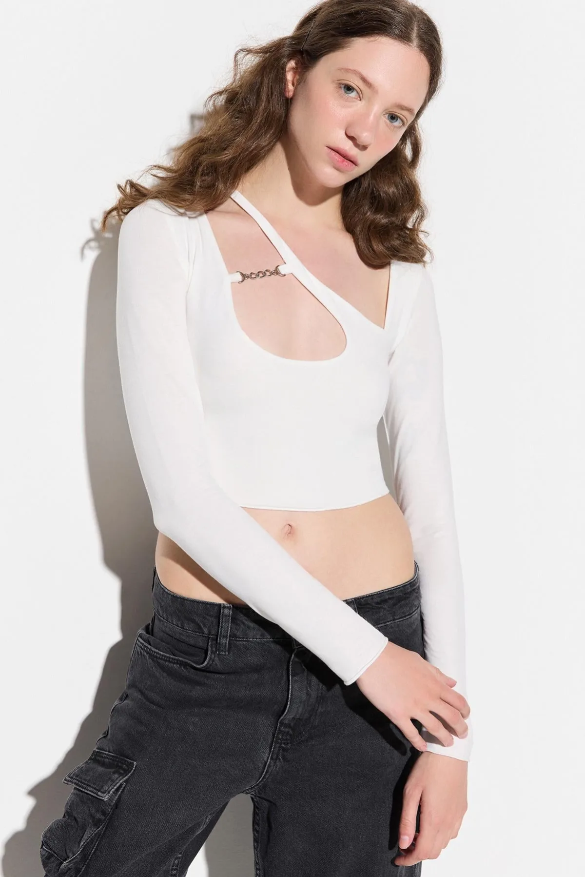 Design: Rechte zoom; Materiaal: Jersey; Motief: Effen; Details: Cut-outs; Extra's: Applicaties; Pasvorm: Aansluitende pasvorm; Armlengte: Lange mouw; Lengte: Korte pasvorm