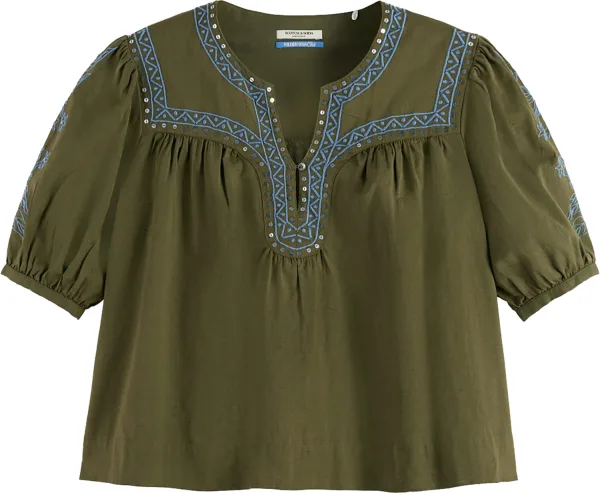 De Embroidered Top van Scotch & Soda is een bohemian dames top korte mouw met een V-hals, gemaakt van katoen. Het heeft een losse pasvorm en korte mouwen, met een opvallend grafisch patroon dat een stijlvolle en modieuze uitstraling biedt.