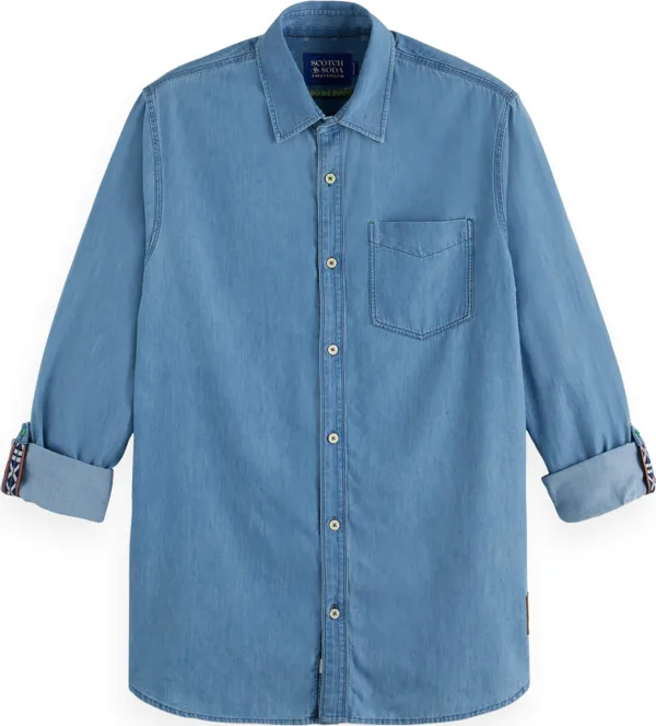 Het Easy lightweight denim shirt met lange mouwen van Scotch & Soda biedt een casual stijl voor de zomer. Gemaakt van denim, met zakken op de voorzijde en knoopsluiting, is het effen patroon en de manchetten met knopen ideaal voor elke gelegenheid. Perfect voor heren.