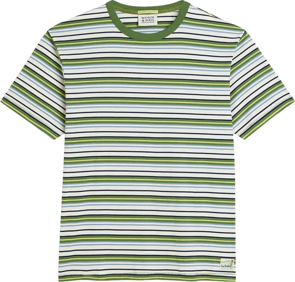 T-shirt, t-shirt van Scotch & Soda met ronde hals, korte mouwen en streeppatroon in wit, blauw en groen. De ribboord bij hals en mouwzoom geeft een nette afwerking, de rechte zoom draagt comfortabel. Combineer met jeans of chino voor een relaxte, casual outfit.