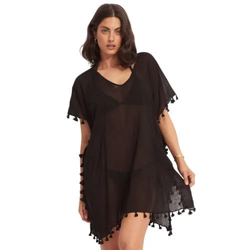 Dames kaftan van het merk Seafolly. Het model van gekreukeld materiaal is licht doorschijnend en daardoor leuk over een bikini of badpak. Onderaan en aan de korte mouwen zitten kwastjes en de kaftan heeft een wijde hals.