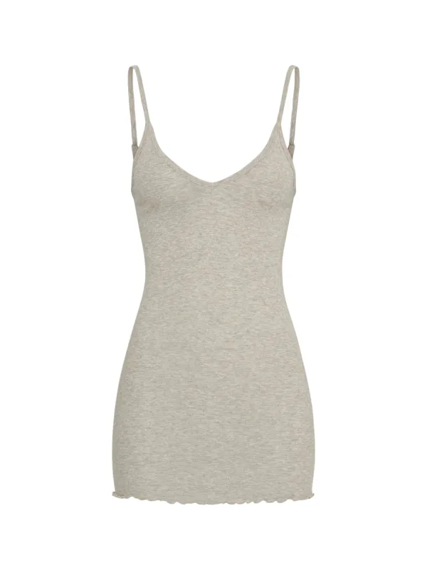 Design: Diepe snit/decolleté, Geschulpte zoom; Materiaal: Jersey; Halstype: Ronde hals; Motief: Mélange; Soort bandjes: Spaghettibandjes; Extra's: Verstelbare bandjes, Voelt zacht aan; Pasvorm: Slanke pasvorm; Armlengte: Mouwloos; Lengte: Normale lengte