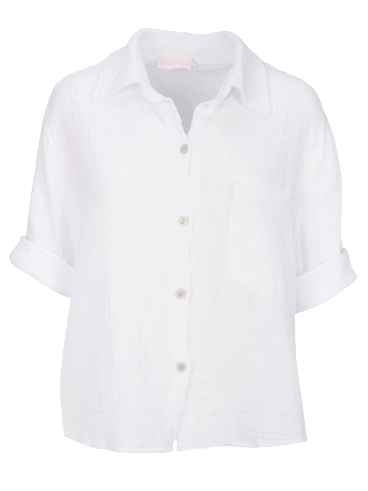 Blouse type: Klassieke blouse; Design: Knop sluiting; Type sluiting: Knoopsluiting; Materiaal: Mousseline; Motief: Effen; Kraag: Kentkraag; Extra's: Op staal naden; Pasvorm: Losse pasvorm; Armlengte: Halve mouw; Lengte: Normale lengte