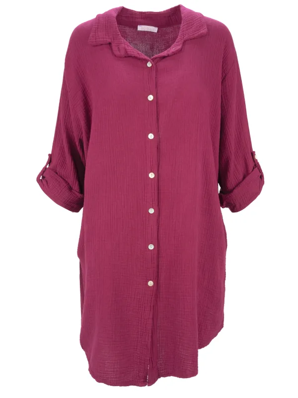 Blouse type: Klassieke blouse; Design: Knop placket, Oversized, Ronde zoom; Type sluiting: Knoopsluiting; Materiaal: Mousseline; Motief: Effen; Details: Plooien; Extra's: Op staal naden; Pasvorm: Wijde pasvorm; Armlengte: Lange mouw; Lengte: Lange pasvorm