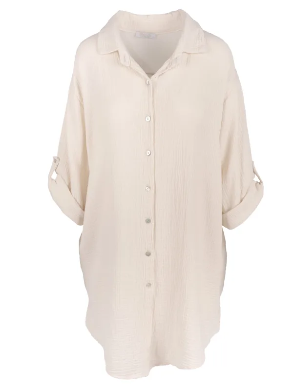Blouse type: Klassieke blouse; Design: Gevoerde zoom/rand, Knop placket, Revers kraag; Type sluiting: Knoopsluiting; Materiaal: Mousseline; Motief: Effen; Details: Plooien; Extra's: Op staal naden, Voelt zacht aan; Pasvorm: Wijde pasvorm; Armlengte: Lange mouw; Lengte: Lange pasvorm