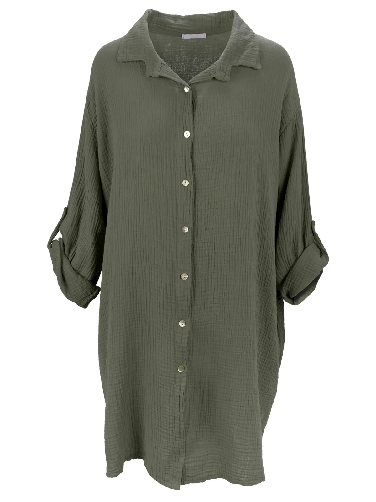 Blouse type: Klassieke blouse; Design: Knop placket, Turn-down kraag; Type sluiting: Knoopsluiting; Materiaal: Mousseline; Motief: Effen; Details: Plooien; Extra's: Op staal naden; Pasvorm: Wijde pasvorm; Armlengte: Lange mouw; Lengte: Lange pasvorm