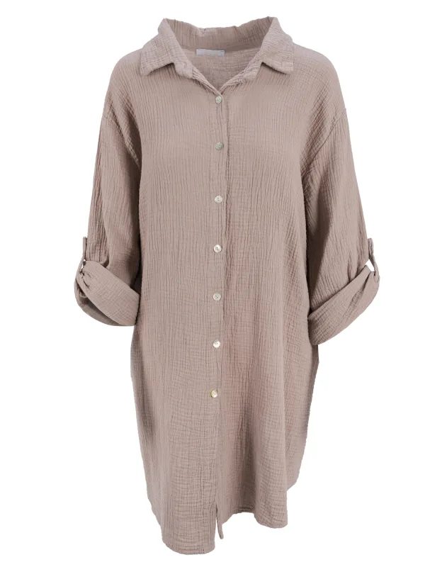 Blouse type: Klassieke blouse; Design: Rugplooi, Ronde zoom, Verlengd rugpand, Roll-up mouwen; Type sluiting: Knoopsluiting; Materiaal: Mousseline; Motief: Effen; Details: Plooien; Extra's: Op staal naden; Pasvorm: Wijde pasvorm; Armlengte: Lange mouw; Lengte: Lange pasvorm