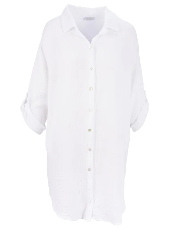 Blouse type: Klassieke blouse; Design: Knop placket, Oversized; Type sluiting: Knoopsluiting; Materiaal: Mousseline; Motief: Effen; Details: Plooien; Extra's: Lichte stof; Pasvorm: Wijde pasvorm; Armlengte: Lange mouw; Lengte: Lange pasvorm
