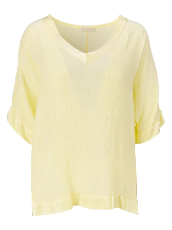 Blouse type: Blouseshirt; Design: Materiaal mix; Materiaal: Viscose; Motief: Effen; Kraag: Zonder kraag; Details: Plooien; Extra's: Gestructureerd oppervlak, Gladde stof, Voelt zacht aan; Pasvorm: Losse pasvorm; Armlengte: Halve mouw; Lengte: Normale lengte
