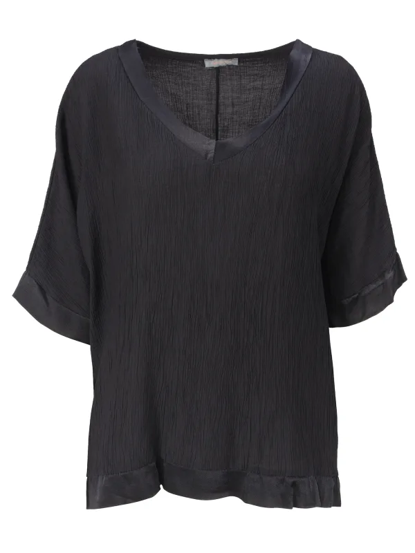 Blouse type: Blouseshirt; Design: Diepe snit/decolleté, Overcut schouder; Materiaal: Viscose; Motief: Effen; Kraag: Zonder kraag; Details: Plooien; Extra's: Gestructureerd oppervlak, Gladde stof, Crinkle look; Pasvorm: Losse pasvorm; Armlengte: Halve mouw; Lengte: Normale lengte