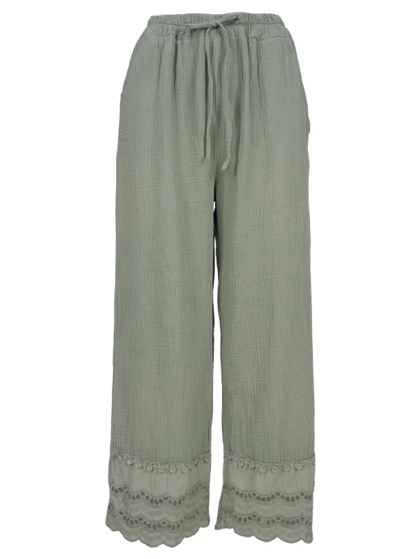 Design: Taille met trekkoord, Elastische taille/zoom, Geschulpte zoom; Type sluiting: Elastische band; Materiaal: Mousseline; Motief: Effen; Details: Borduursels, Mesh; Extra's: Op staal naden; Lengte: Lang/maxi; Pasvorm: Wide leg; Taillehoogte: Mid waist