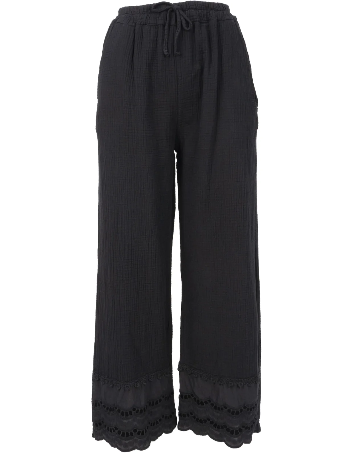 Design: Elastische taille/zoom; Type sluiting: Elastische band; Materiaal: Mousseline; Motief: Effen; Details: Borduursels, Mesh; Extra's: Op staal naden; Lengte: Lang/maxi; Pasvorm: Wide leg; Taillehoogte: Mid waist