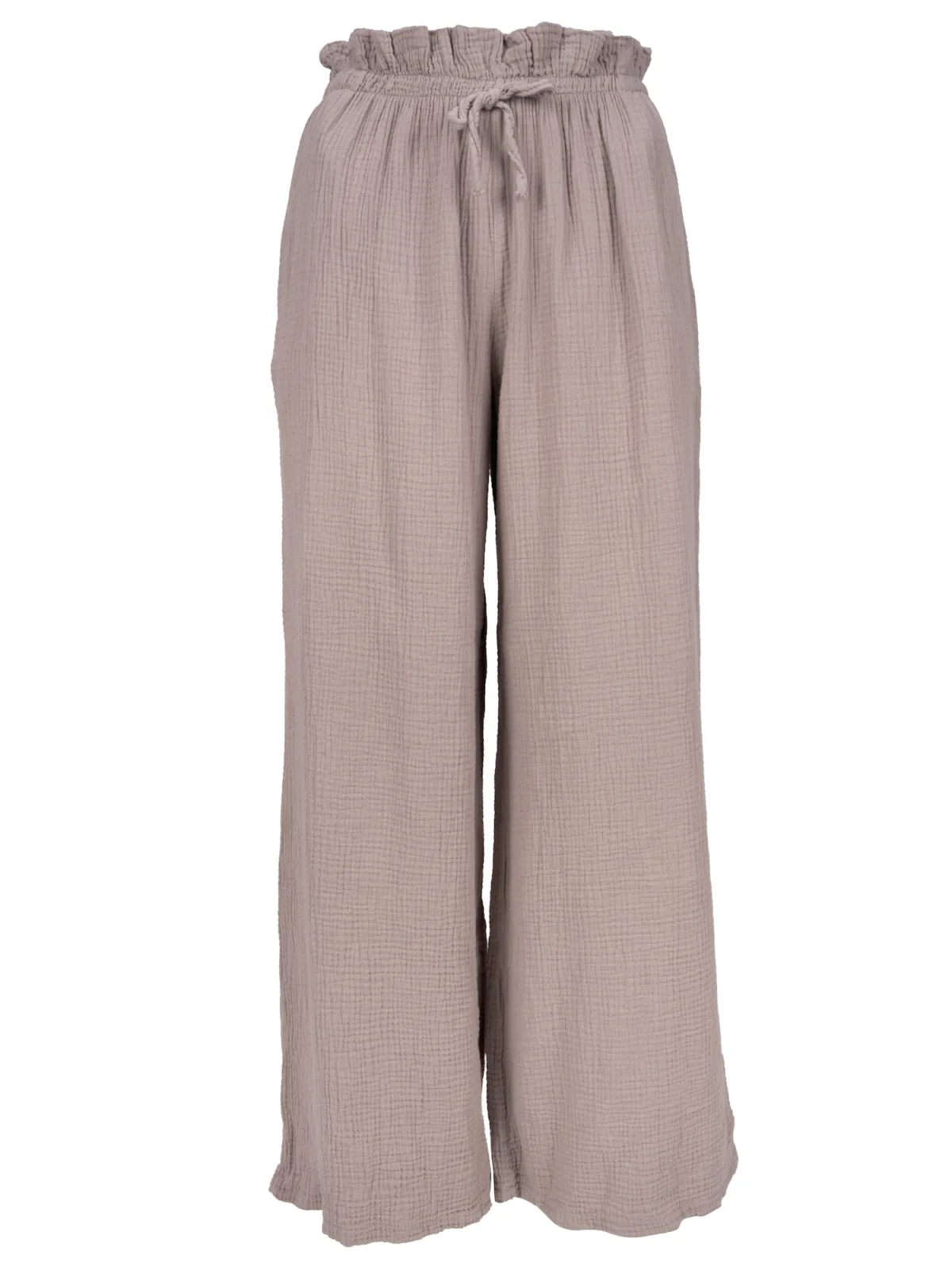 Design: Elastische taille/zoom; Type sluiting: Elastische band; Materiaal: Mousseline; Motief: Effen; Details: Ruches, Gedrapeerd; Extra's: Op staal naden; Lengte: Lang/maxi; Pasvorm: Wide leg; Taillehoogte: Mid waist