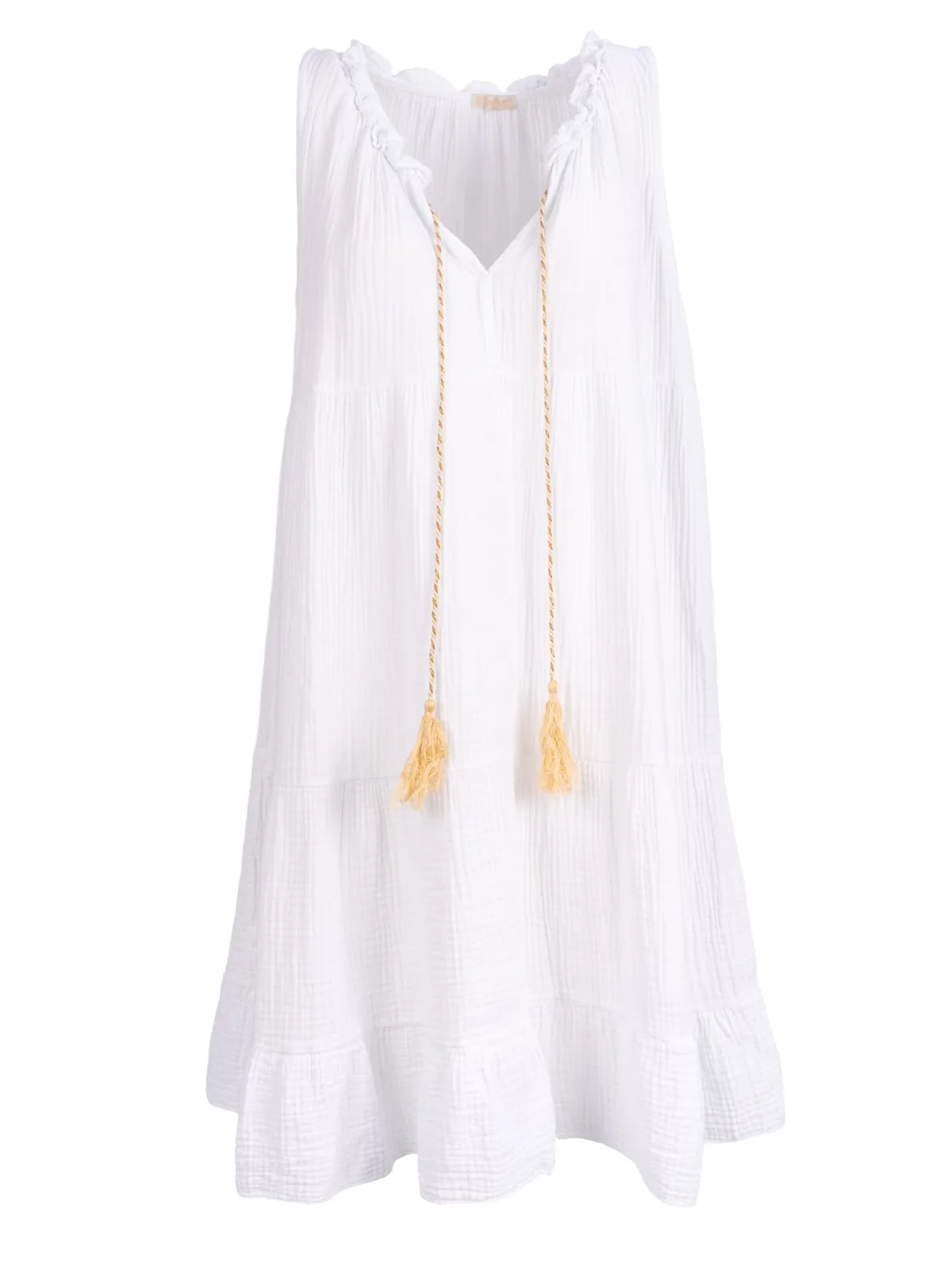 Design: Om te knopen/binden; Type sluiting: Slip; Materiaal: Mousseline; Halstype: Ronde hals; Motief: Effen; Soort bandjes: Brede bandjes; Details: Ruches, Volant, Gedrapeerd; Extra's: Op staal naden; Lengte: Knielengte; Snit: Uitlopend; Pasvorm: Losse pasvorm; Armlengte: Mouwloos