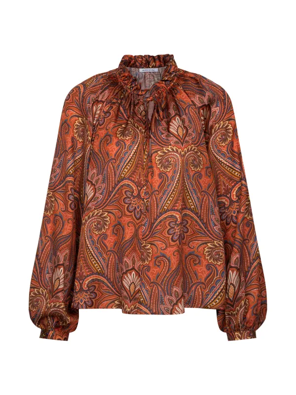 Blouse type: Blouseshirt; Design: Gevoerde zoom/rand; Materiaal: Satijn; Motief: Paisley; Kraag: Opstaande kraag; Details: Ruches, Gedrapeerd; Extra's: Gladde stof; Pasvorm: Losse pasvorm; Armlengte: Lange mouw; Lengte: Normale lengte