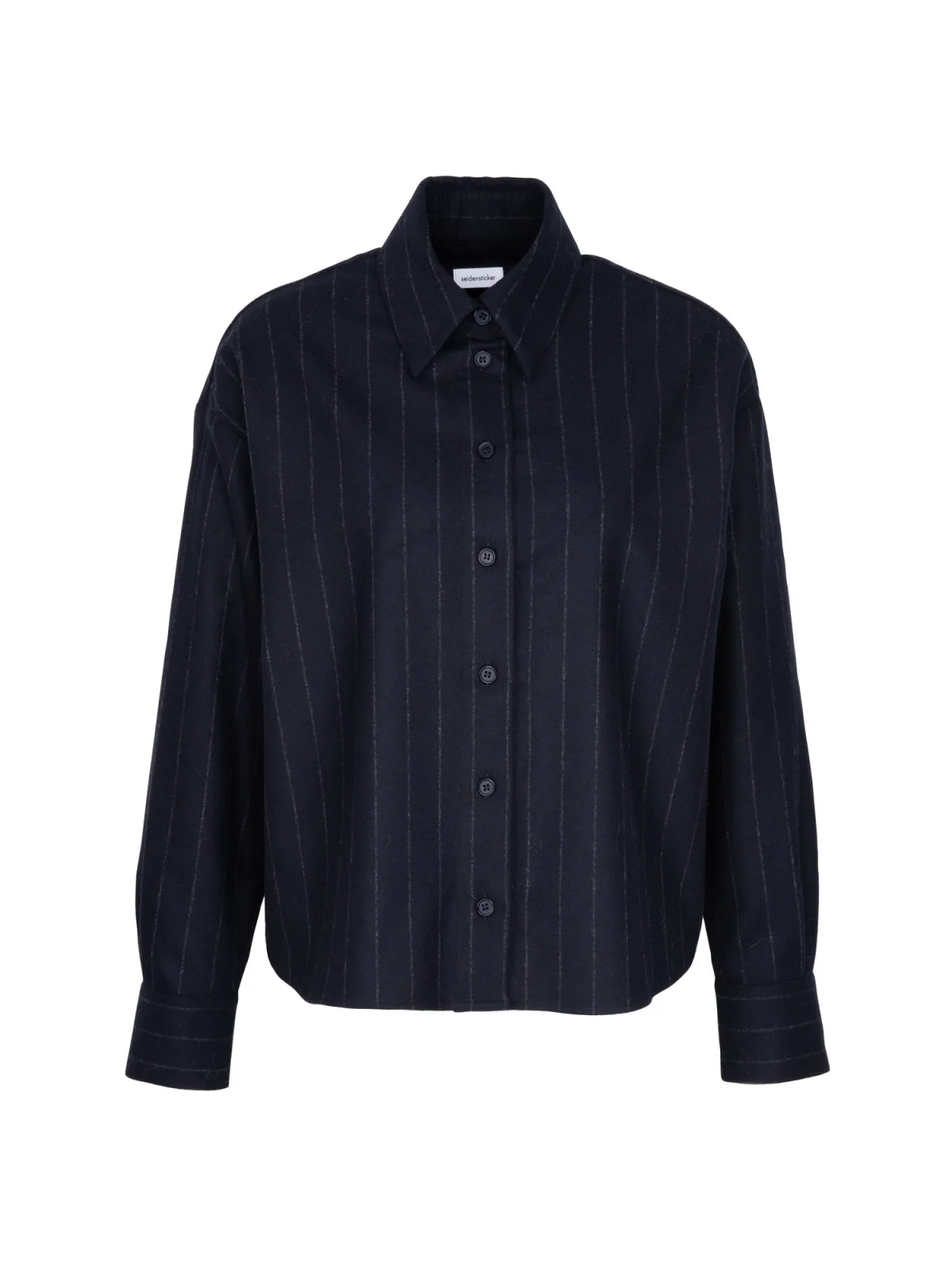 Blouse type: Klassieke blouse; Design: Gevoerde zoom/rand; Type sluiting: Knoopsluiting; Materiaal: Wol; Motief: Krijtstrepen; Kraag: Kentkraag; Details: Plooien; Extra's: All-over patroon, Label patch/label flag; Pasvorm: Losse pasvorm; Armlengte: Lange mouw; Lengte: Normale lengte
